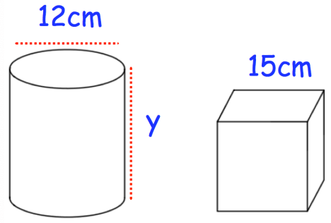 🖐🏼The cylinder and the cube below have the same volume. Find the length of y: