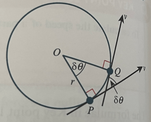 We will let the angle POQ be very small and call it 𝛿𝜽. At point P the particle is moving at linear speed v. As Q is very close to P, we can assume that the speed at Q has components parallel and perpendicular to the tangent at P of vcos𝛿𝜽 and vsin𝛿𝜽.