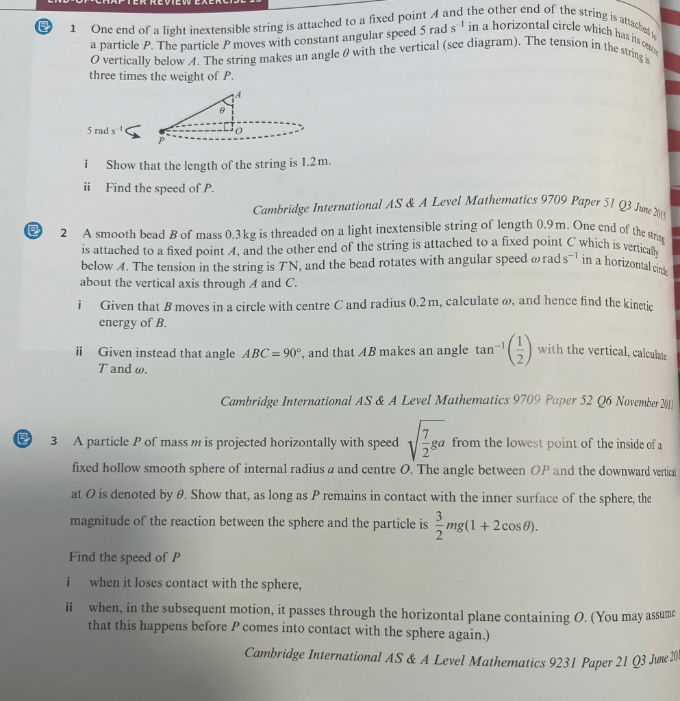 1.) A particle of mass 0.9kg is attached to a light inextensible string of length 2.4m. The other end of the string is attached to a fixed point on the ceiling. The particle is describing horizontal circles with the string taut and making an angle of 25º with the downward vertical. Find the speed of the particle.
