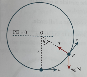 We consider a particle with mass m attached to a light inelastic string of length r. It is initially at rest in equilibrium, then projected with speed u from its lowest point. We assume no resisting forces and so use the principle of conservation of energy.