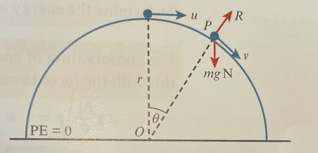 When the particle leaves the surface, R=0, so . This is a useful result, as it tells us that if u is almost zero, then cos𝜽 is almost 2/3, so with a slight push the particle will leave the surface after 48.2º.