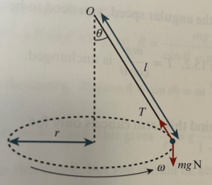 We consider now the conical pendulum model, with a light inelastic string with one end attached to a fixed point O and the other end having a particle following small horizontal circles, as in the diagram below: