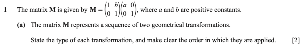 In a shear, all points in the plane are stretched in the same direction, but the extent of the stretch is proportional to the distance from the axes. Below shows the effect of a transformation of on the unit square: