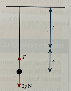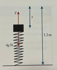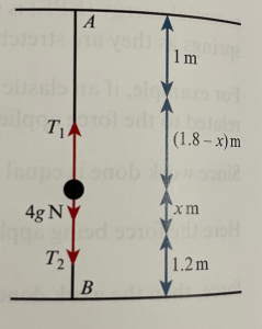 Some questions may be more complicated. Let’s consider a particle of mass 4kg tied to two light elastic strings, a top string with natural length 1m and modulus of elasticity 3g N and a bottom string with natural length 1.2m and modulus of elasticity 2g N.