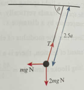A light, elastic string, of natural length 2a, has a mass of 2m attached to one end. The string is in a vertical plane and the system rests in equilibrium with the aid of a horizontal force of magnitude mg.