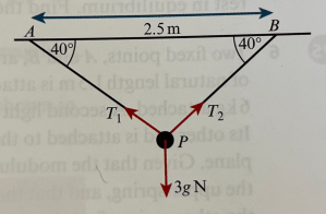 A light, elastic string of natural length 1.5m is stretched between points A and B that are 2.5m apart (in a horizontal line). A particle, P, of mass 3kg, is attached to the midpoint of the string. The string rests in equilibrium with the parts of the string making an angle of 40° to the horizontal, as shown in the diagram above.