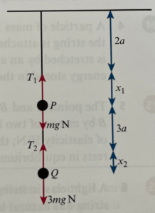 A light, elastic string, of natural length 2a and modulus of elasticity 7mg, has one end tied to a point on a ceiling. The other end of the string is attached to a particle, P, of mass m. A second light, elastic string, of natural length 3a and modulus of elasticity 5mg, is tied to P. Its other end is attached to a second particle, Q, of mass 3m. Q is vertically below P.