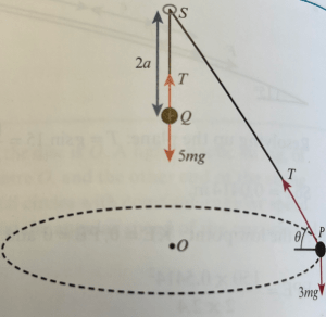 A particle, P, of mass 3m, is attached to one end of a light elastic string of natural length 5a and modulus of elasticity 8mg. The other end of the string is threaded through a small smooth ring S and a second particle Q of mass 5m is attached to this end. The particle P describes horizontal circles with angular speed ω. Particle Q remains stationary at a distance of 2a below the ring.