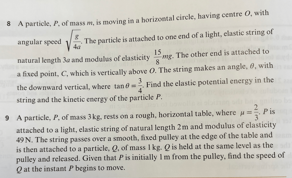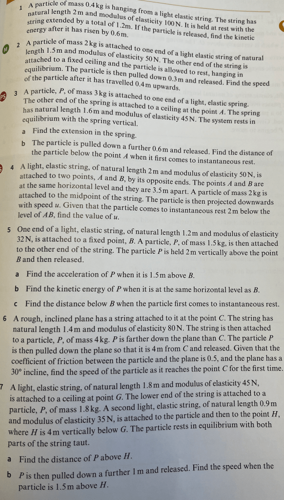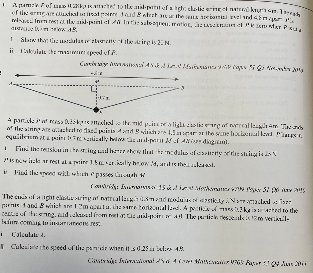 - A light elastic string has one end attached to a ceiling. The other end is attached to a particle of mass 3m. The string has natural length 2a and modulus of elasticity 6mg. The particle rests in equilibrium.