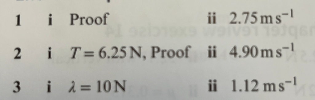 - A light string of unknown natural length is fixed to a ceiling at one end, with a mass of 0.4kg attached to the other end. The string is allowed to hang in equilibrium such that the length of the string is now 15cm. If the modulus of elasticity is 20N, find the natural length of the string.