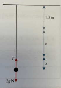 First we must find the initial extension of the string, e. Using Hooke’s Law we get , and so e = 0.75m.