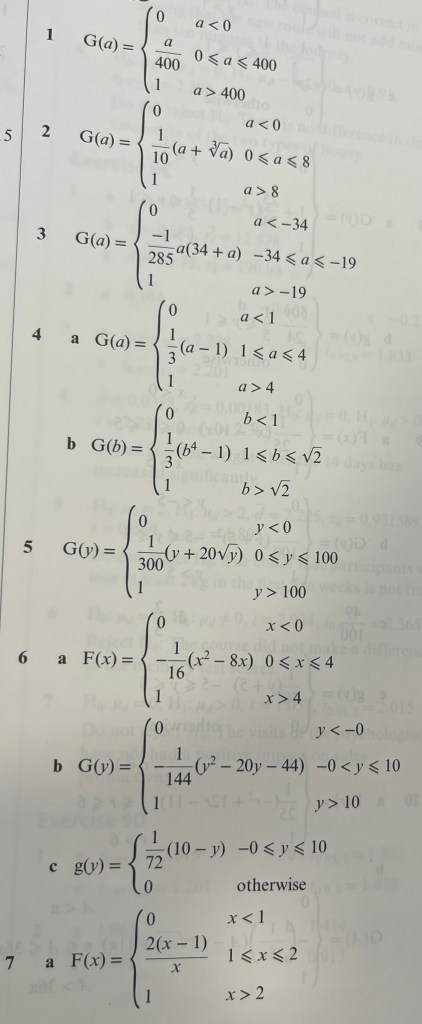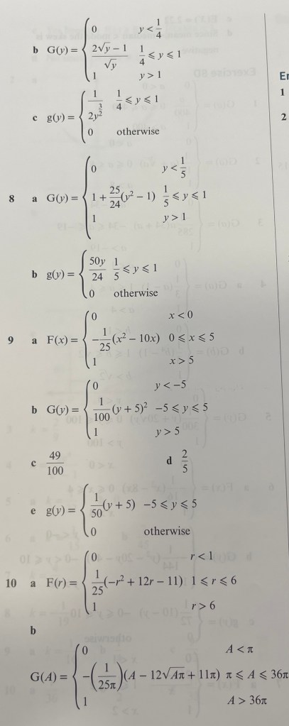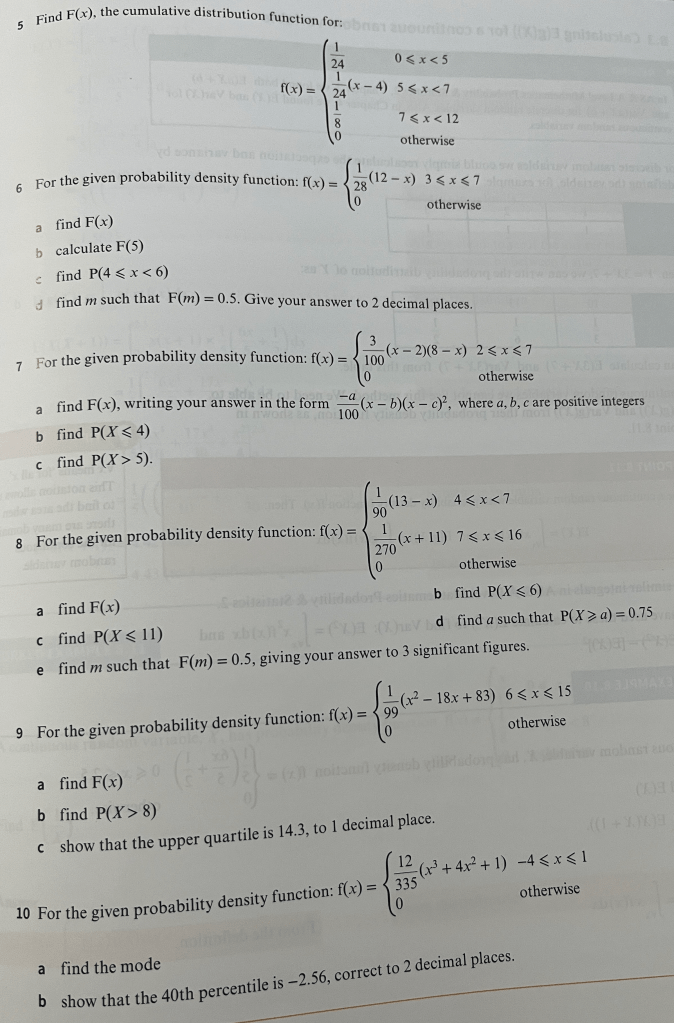 In question 5 below, we can’t use boundary conditions for the middle piece, but we can use the fact that as the cdf must be continuous, so f(5) must give the same value in each of the first two pieces.