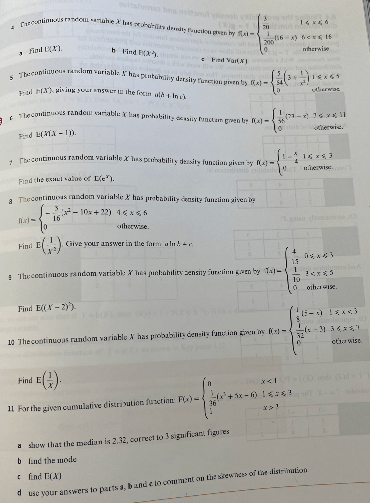 The continuous random variable X has probability density function for 1≤x≤5 or 0 otherwise. Find the cumulative distribution function. (NB. We can do this by finding the indefinite integral, then using one of the boundary conditions to find the constant of integration or by using definite integration with “x” as the upper limit and the lower limit of the interval as the lower limit).
