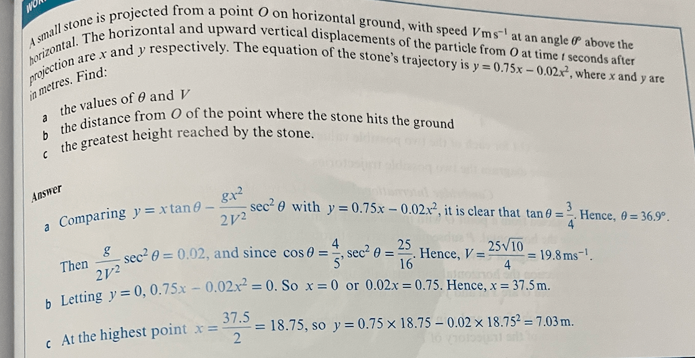 - A particle is projected from a point on a horizontal plane with speed 20ms-1 at an angle of elevation of 𝜽. Given that the particle passes through the point x=20, y=10, find the possible angles of elevation.