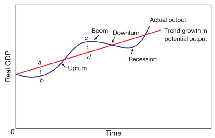 A trade cycle (also known as a business cycle or economic cycle) is a period of time within which there are fluctuations in economic activity. This is demonstrated below (note that ab is a temporary negative output gap and cd is temporary positive output gap):