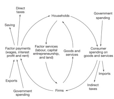 In practice, there is some leakage from the circular flow, as some income is saved, some is taxed and some is spent on imports. There are also additional injections, due to foreign investment and foreign spending on domestic products. The below diagram, for an open economy, includes these: