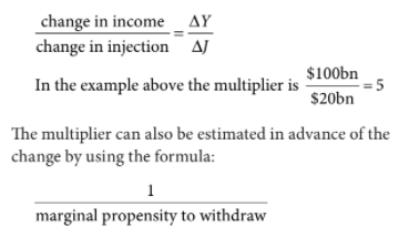 The multiplier shows the relationship between an initial change in spending and the final rise in GDP. It occurs because a rise in expenditure creates incomes, some of which are then spent creating further incomes. e.g. If people spend 80% of any extra income, an increase in government spending of $20b will cause a final rise in GDP of $100b. (e.g. because $20b spent by the government will lead people to spend $16b of their extra incomes, which will lead to a further group of people spending $12.8b, etc. until incomes have increased to $100b and the change in injections is matched by the change in withdrawals).