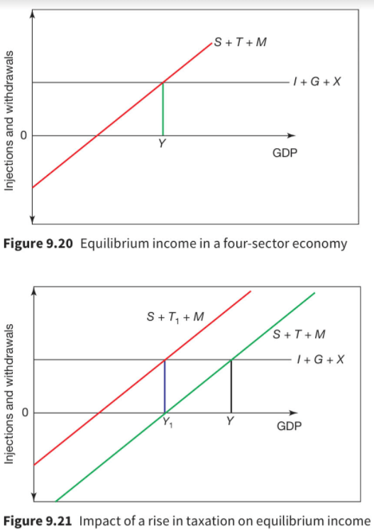 A fall in savings has a similar effect. The below diagrams shows equilibrium income where I + G + X = S + T + M in a four sector economy followed by the impact if tax rates rise without any change in government spending: