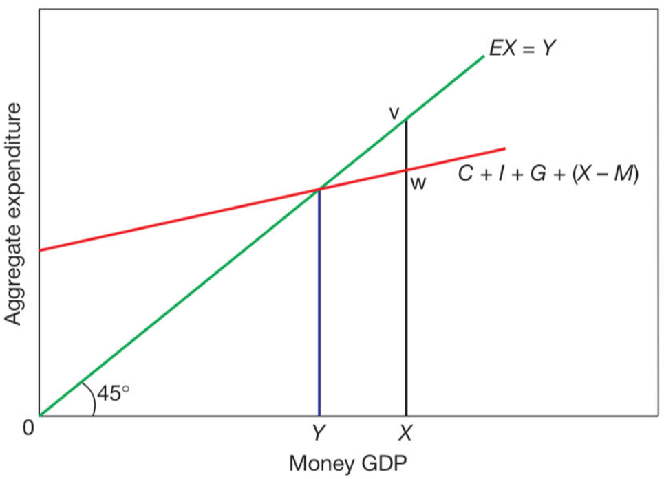 If the equilibrium level of GDP is below the full employment level, then there is a deflationary gap, as shown below, where the lack of aggregate expenditure results in an equilibrium level Y of GDP, below the full employment level of X. The deflationary gap is vw.