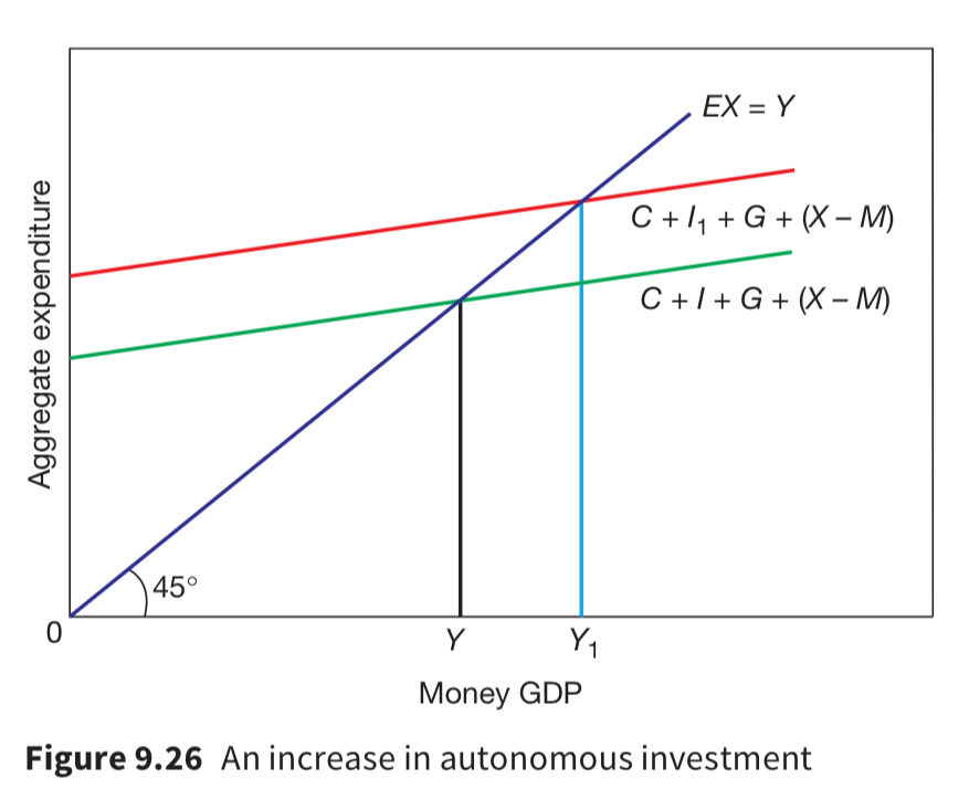 The portion of investment that does not depend on changes of income is called autonomous investment. This might be a firm buying capital goods because they are optimistic about the future or because of a drop in the interest rate. The impact of an increase in autonomous expenditure is shown below: