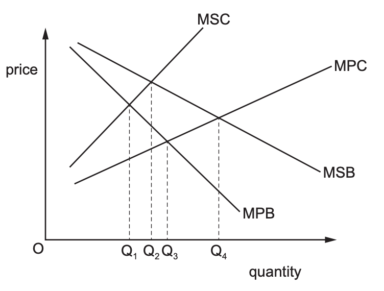 3. The expected marginal private benefits (MPB), marginal social benefits (MSB), marginal private costs (MPC) and marginal social costs (MSC) for the building of a new road are shown in the diagram. The government intervenes so that the socially desirable output is achieved.