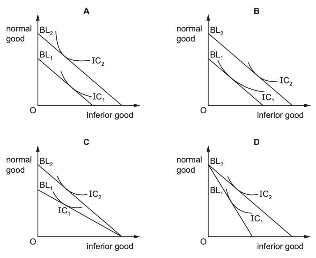 5. The diagrams show a consumer’s indifference curves (IC) and budget lines (BL) for an inferior good and a normal good.