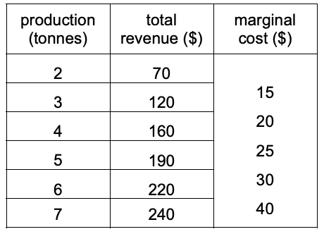 1. The table shows the total revenue and marginal cost of a firm at different levels of production.