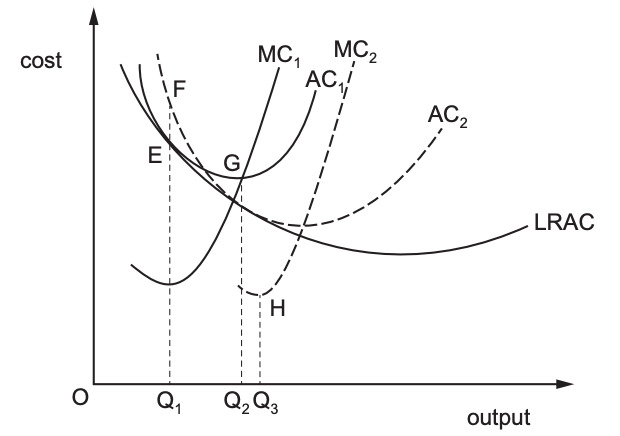 B At output Q1, point F is preferred to point E because curve AC2 represents economies of