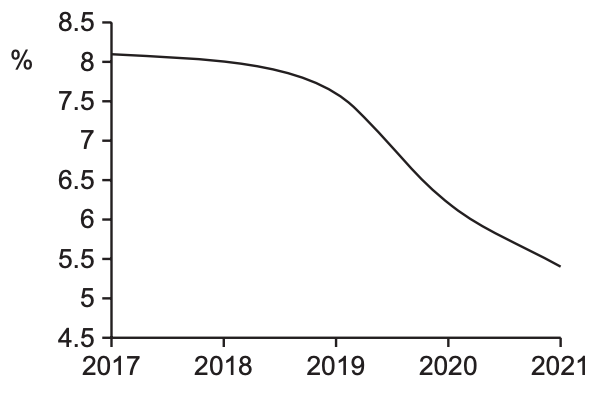 2. The graph shows the percentage unemployed in a country for the period 2017–2021.