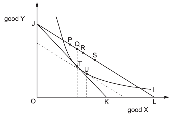 4. The diagram shows budget lines and an indifference curve. The consumer’s initial position is T.