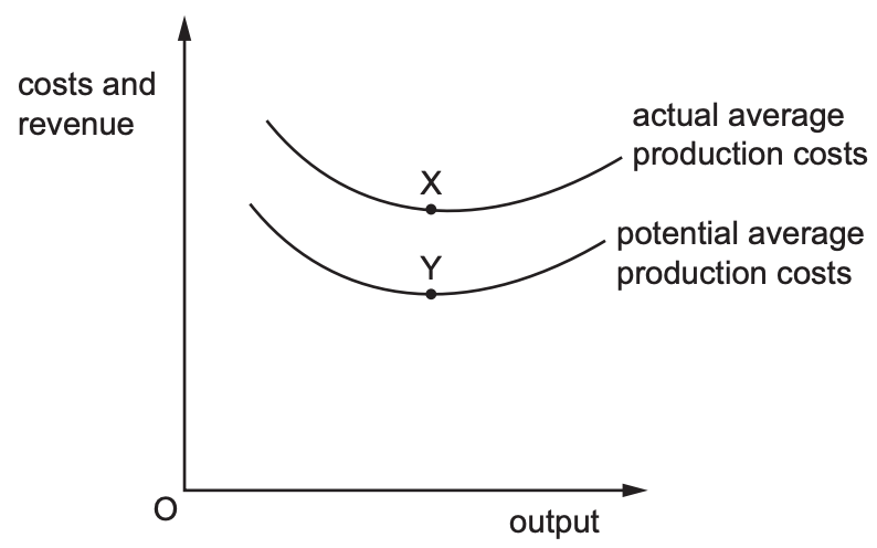 If a firm moved from point X to Y, what is most likely to happen to the productive efficiency and x-inefficiency of this firm?