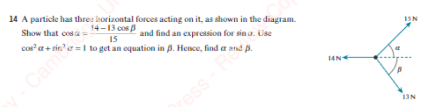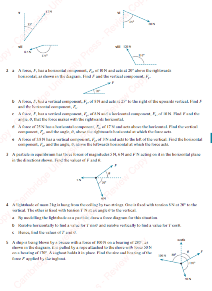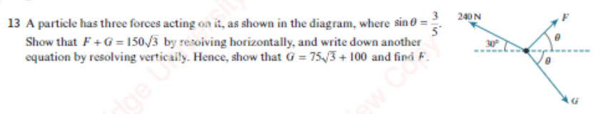 - A particle in equilibrium has 3 forces of magnitude 5N, 6N and FN acting on it in the directions shown. Find the values of F and 𝜽: