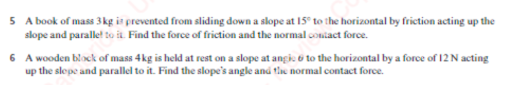 - A crate of mass 30kg is at rest on a ramp that is sloped at an angle of 18º to the horizontal. The crate is prevented from sliding down the ramp by friction. Find the frictional force and the normal contact force.