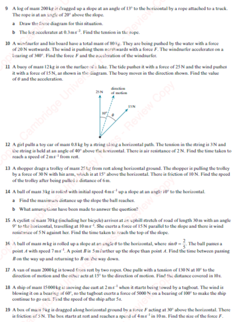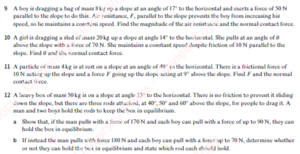 - A book of mass 5kg sits on a slope inclined at 20º to the horizontal. It is held in equilibrium and prevented from sliding down the slope by a frictional force. The book is then pulled up the slope at a constant speed, using a rope that makes an angle of 50º with the horizontal. Assume that the frictional force has the same magnitude as before and now acts down the slope. Find the tension in the rope.