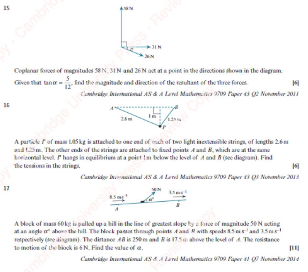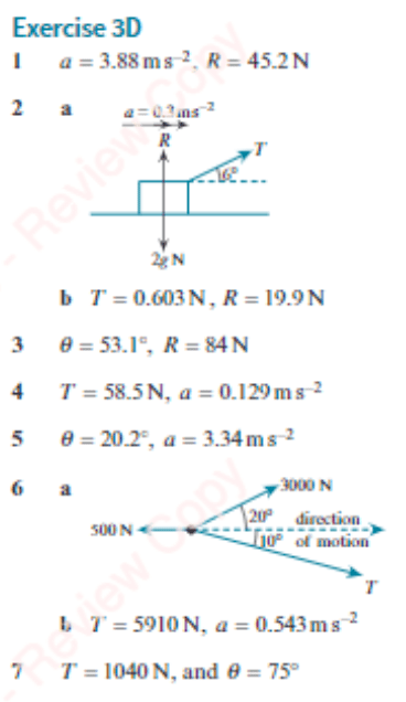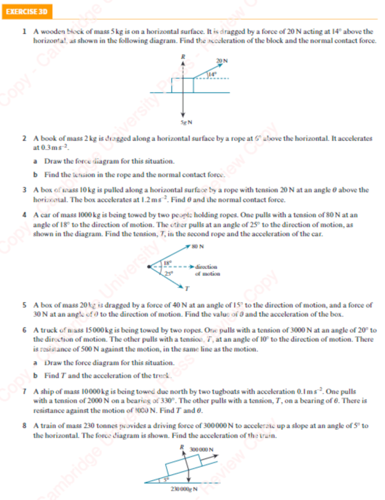 - A box of mass 15kg is dragged along the floor at a constant speed of 1.2ms-1 by means of a rope at 30º to the horizontal. The tension from the rope is 50N. Calculate the frictional force resisting the montion and the normal contact force from the floor.