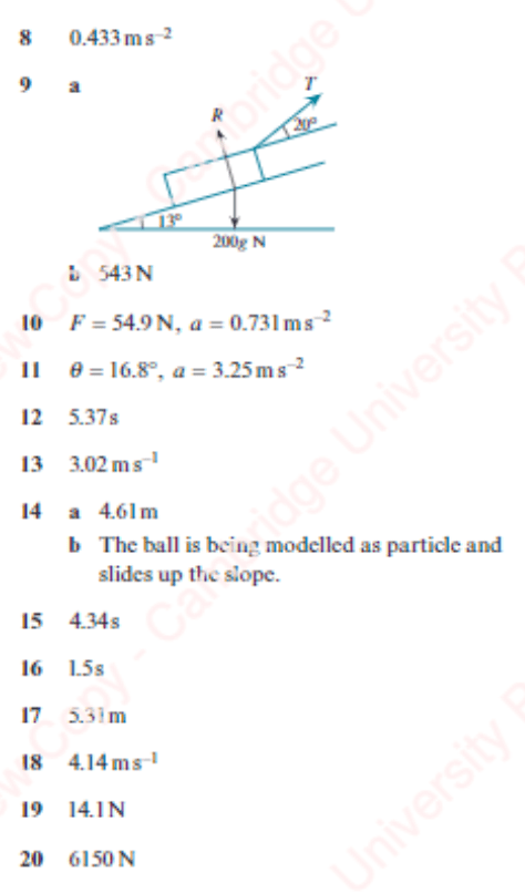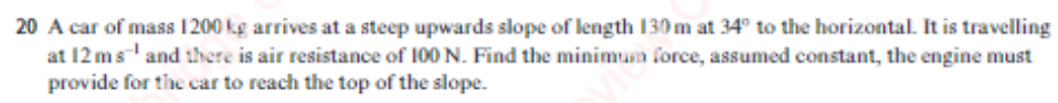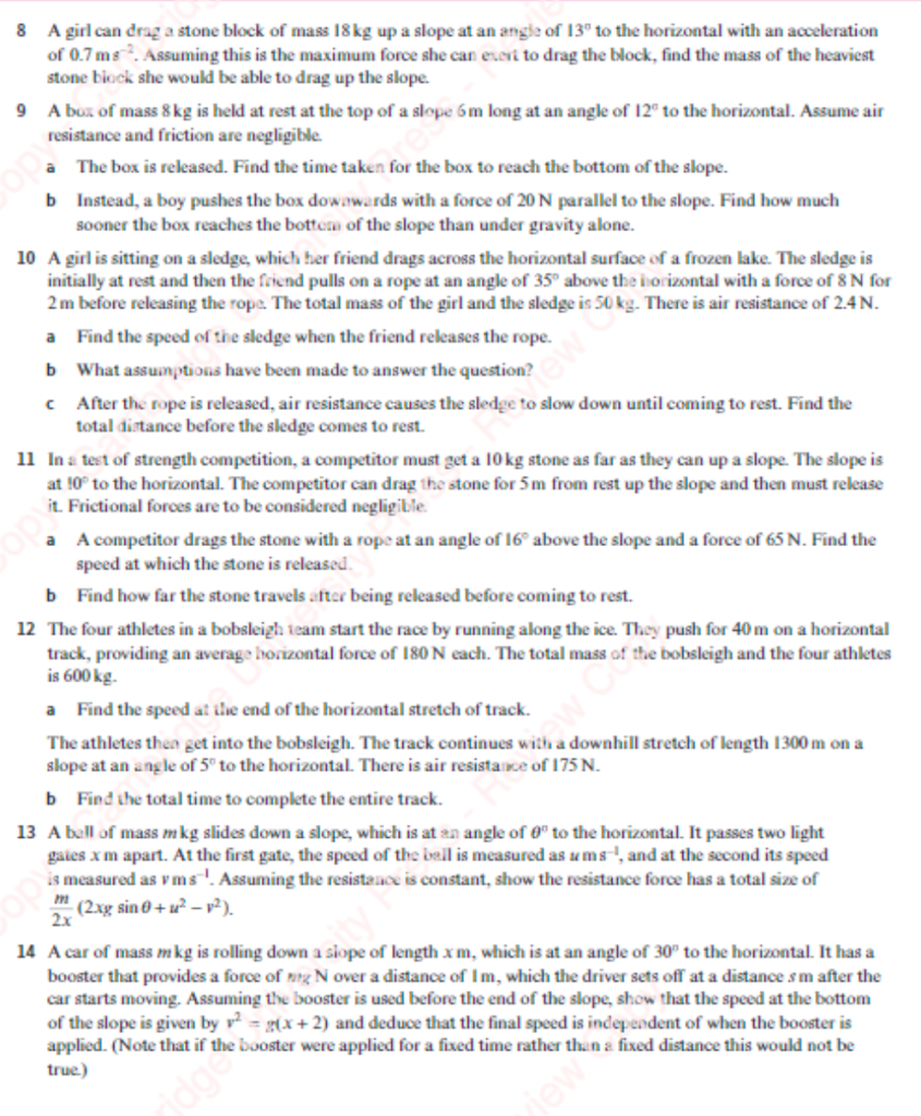 - The cyclist starts to climb a hill when her speed reaches 8ms-1. The hill is at a constant angle of 10º to the horizontal. The driving force and resistances to motion are unchanged. Find the acceleration (or deceleration) of the cyclist on the hill.