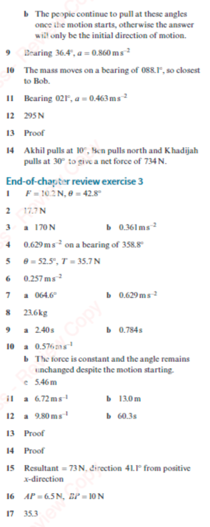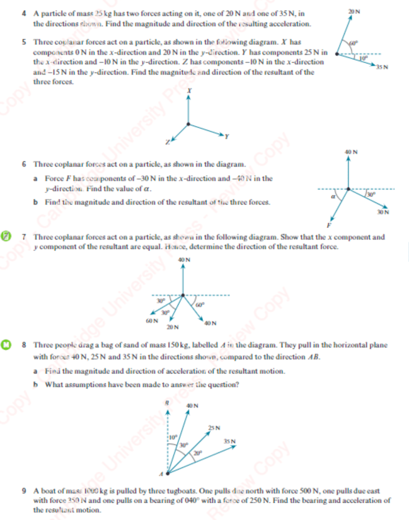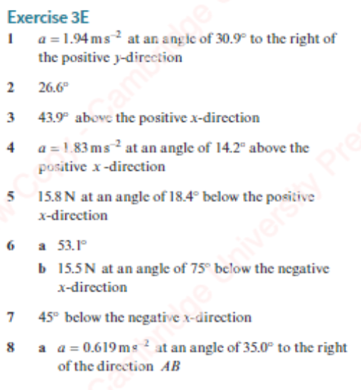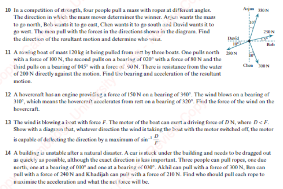 - A raft of mass 50kg is pulled along a canal using two ropes. The rope to the left bank of the canal is at an angle of 20º to the direction of motion with a tension of 100N. The rope to the right bank of the canal is at an angle of 25º to the direction of motion. The resistance to the motion of the raft is 40N. Find the acceleration of the raft.