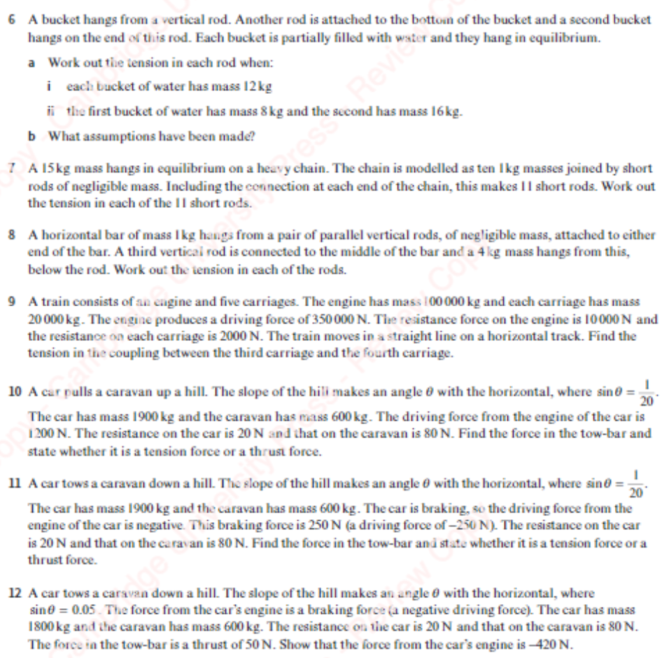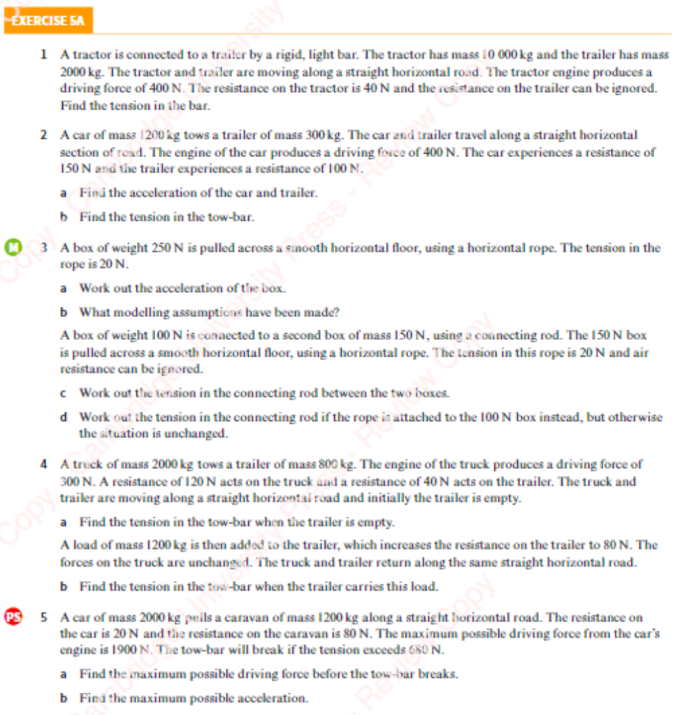 - A car of mass 1500kg is towing a caravan of 500kg along a straight horizontal road. The resistance to motion is 80N on the car and 20N on the caravan. The driving force produced by the engine of the car is 360N. Find the tension in the tow bar.