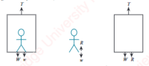 If there is a person in a lift, we can consider the forces acting on the system as a whole, or just on the person or just on the lift, as indicated below. Note that if the lift is accelerating then the reaction force from the lift floor on the person will not be equal to the weight of the person.