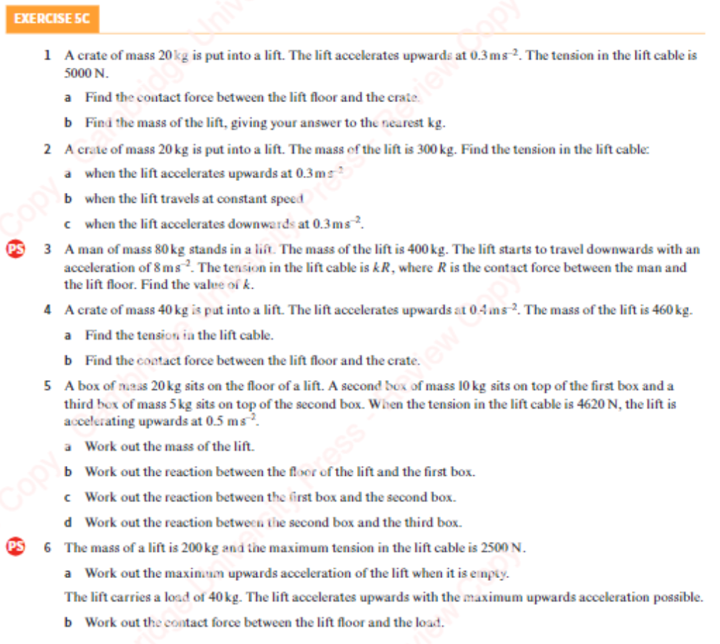 - A woman of mass 50kg is travelling in a lift of mass 450kg. The tension in the cable pulling the lift upwards is 5250N. Calculate the acceleration of the lift.