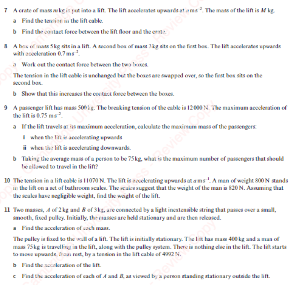 - A man of mass 80kg and a woman of mass 70kg are travelling in a lift of mass 500kg. The tension in the cable pulling the lift upwards is 6890N. Calculate the acceleration of the lift and the reaction forces between the lift floor and each of the passengers.