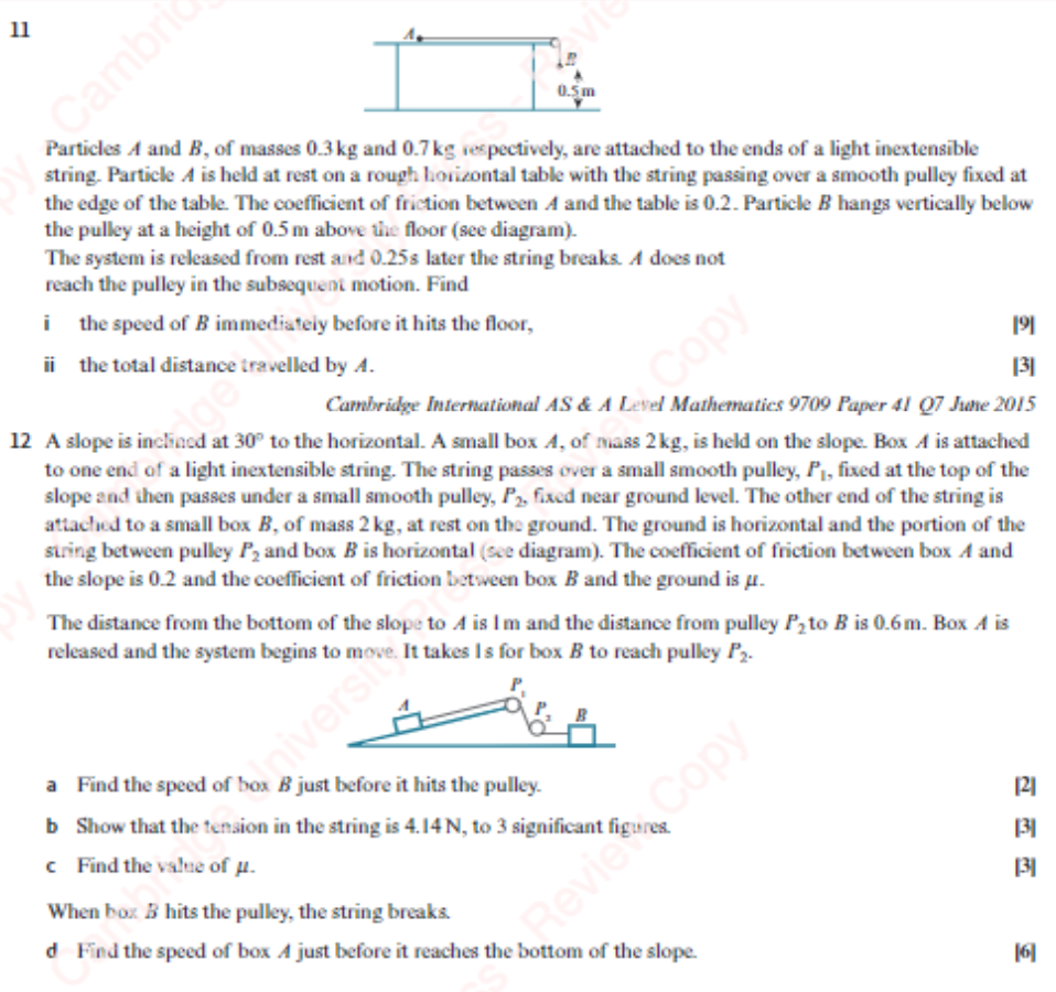 - Two particles A and B of masses 400g and 800g respectively are connected by a light inextensible string. Particle A lies on a rough horizontal table 4.5m from a small smooth pulley which is fixed at the edge of the table. The string passes over the pulley and B hangs freely, with the string taut, 50cm above horizontal ground. The coefficient of friction between A and the table is 0.2. The system is released from rest. Find: