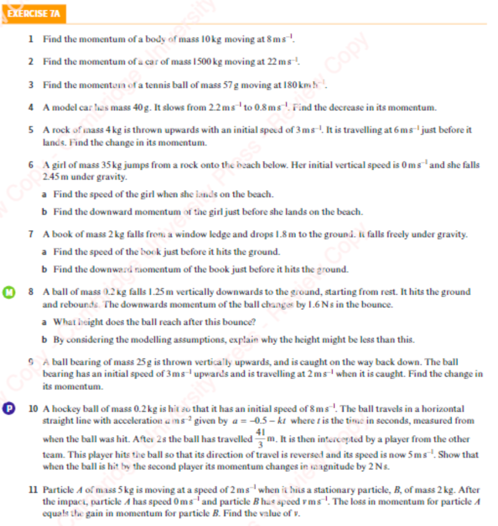 - A tennis ball of mass 50g hits the ground with speed 10ms-1 and rebounds with speed 6ms-1. Find the change in momentum that occurs in the bounce.