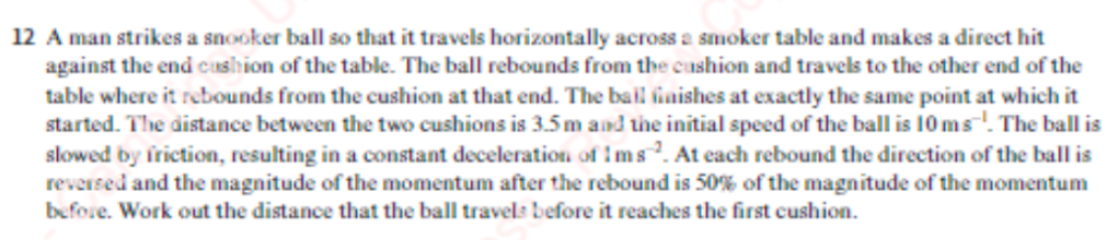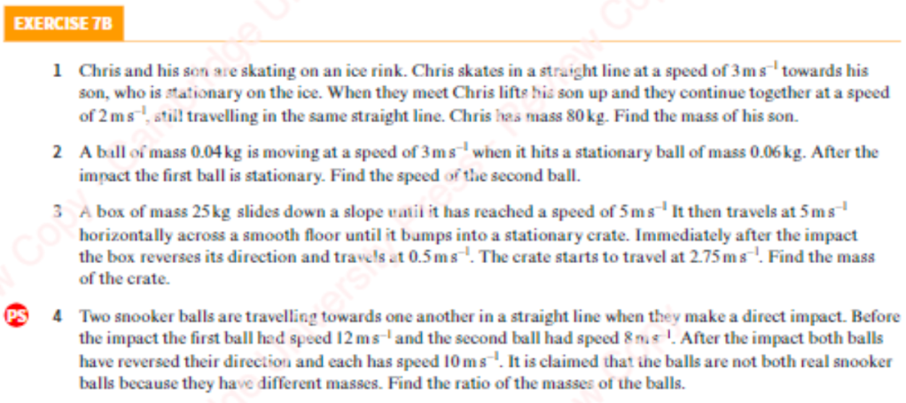 - Two snooker balls are moving directly towards one another. The first snooker ball has mass 200g and is moving at 3ms-1. The second has mass 250g and is moving at 1ms-1. After the collision, the first snooker ball is stationary. What is the speed of the second snooker ball after the collision?