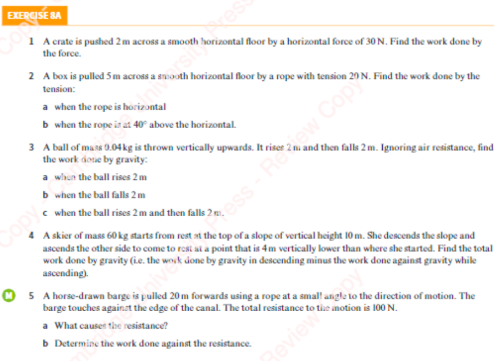 Note that we talk about work done by or against specific forces and in a specific direction. Work done is, however, a scalar quantity measured in Newton metres, typically called Joules. If a particle doesn’t move, then work done is zero.