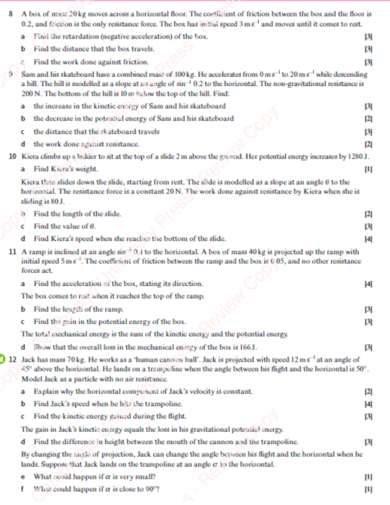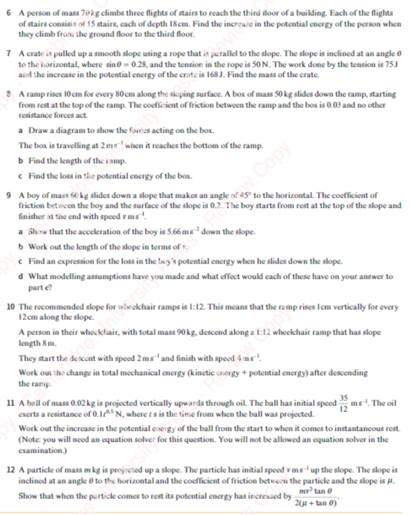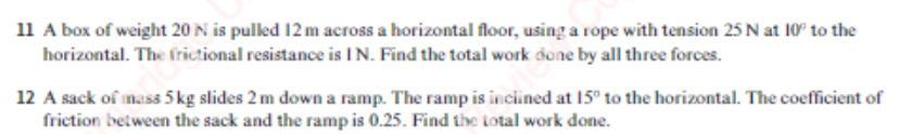 - A book of mass 5kg is pushed up a slope inclined at 30º to the horizontal by a force of 30N at an angle 10º to the slope. The frictional force acting on the book is 2N. The book moves 3m up the slope.