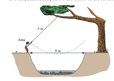 - Evelyn, whose mass is 40kg, takes part in an assault course. The obstacle shown below is a river at the bottom of a ravine 8m wide, which she must cross by swinging on a rope 5m long secured to a branch of a tree immediately above the centre of the ravine. Find out how fast she is travelling at the lowest point of her crossing if: