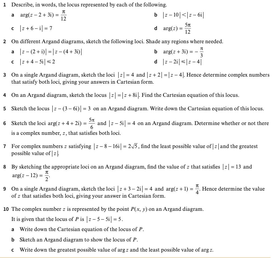 Just like an algebraic equation can be represented by a curve in the Cartesian plane, a complex equation is represented by a “locus” on an Argand diagram. There are a few standard geometrical representations which we need to be aware of.