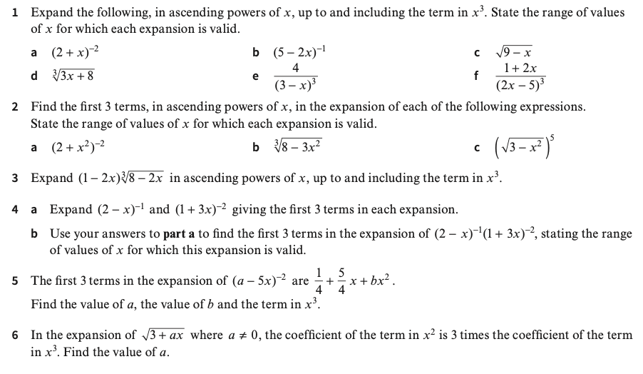 1.) Expand each of the following as a series of ascending powers of x up to and including the term in x3, stating the set of values of x for which the expansion is valid: