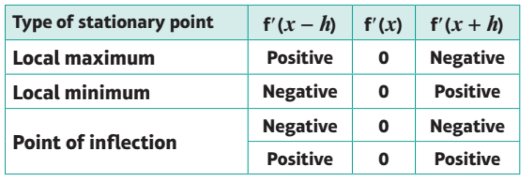 Stationary points can be a local maximum, a local minimum or a point of inflection. We can classify them as follows (for small positive value h):